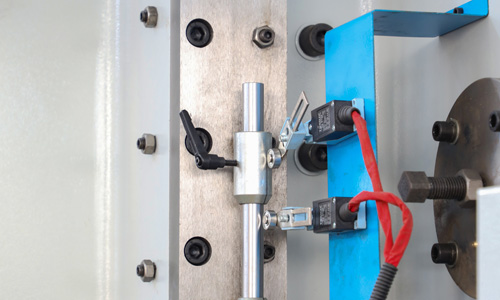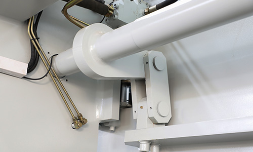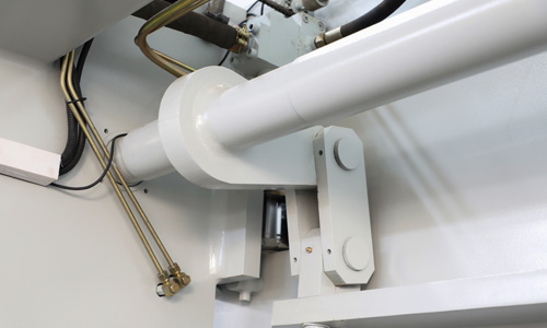 液壓上傳動滑塊同步機構采用扭軸強迫同步和機械擋塊,可選配國產和進口系統(tǒng),工作臺可選撓度補償機構。